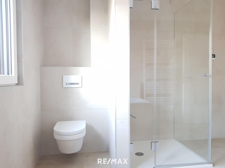 Für reichlich Tageslicht sorgen die bodentiefen Fenster auf der Südseite. Das ganze Haus wird mittels einer Fußbodenheizung temperiert, was für ein besonders behagliches Wohnklima sorgt. Auch das Untergeschoß verfügt über eine Fußbodenheizung und kann beispielsweise als Fitnessraum, Home-Office oder erweiterter Wohnraum genutzt werden. Die Heizung wird von einer ökologisch nachhaltigen Luft-Wasser-Wärmepumpe inklusive Kühlfunktion gespeist. Eine Klimaanlage und elektrisch bedienbare Außenrollläden gehören selbstverständlich zur Grundausstattung. Somit bleibt Ihr Haus auch in den heißen Sommertagen angenehm temperiert. Eine klimafreundliche Photovoltaikanlage ermöglicht Ihnen, eigenen Strom zu produzieren.