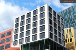 - Fassadenelemente im Rastermaß von 1,40 m mit öffenbaren Kippflügeln an jeder zweite Achse