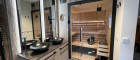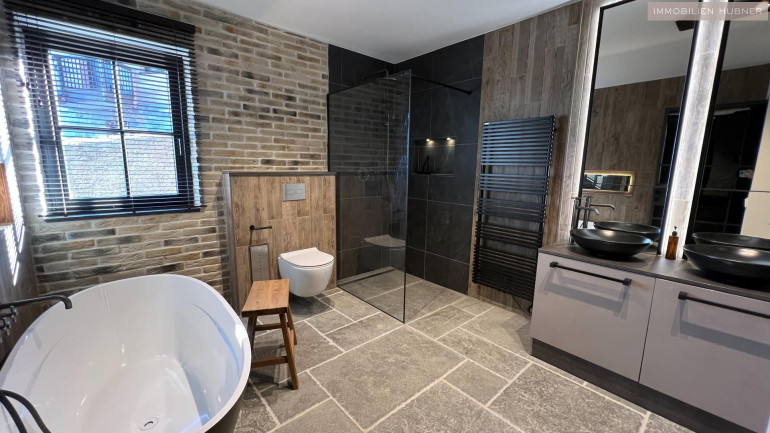 • Exklusives Bad mit Badewanne mit Blick in die Berge, WC, Doppelwaschtisch, bodengleiche Regendusche und eine eigene finnische Sauna