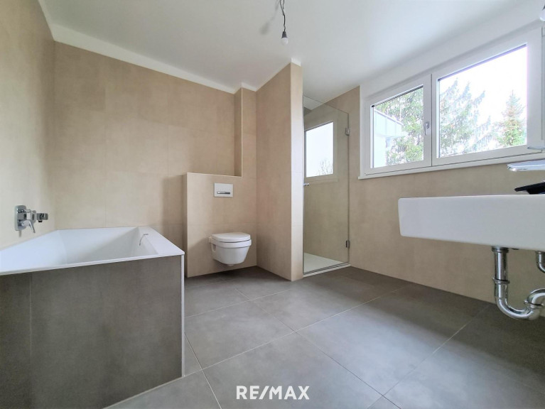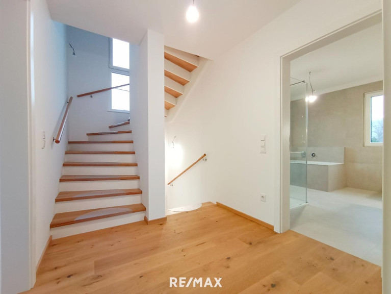 Für reichlich Tageslicht sorgen die bodentiefen Fenster auf der Westseite. Das ganze Haus wird mittels einer Fußbodenheizung temperiert, was für ein besonders behagliches Wohnklima sorgt. Auch das Untergeschoß verfügt über eine Fußbodenheizung und ist daher beispielsweise als Fitnessraum, Home-Office oder erweiterter Wohnraum geeignet. Die Heizung wird von einer ökologisch nachhaltigen Luft-Wasser-Wärmepumpe inklusive Kühlfunktion gespeist. Eine Klimaanlage und elektrisch bedienbare Außenrollläden gehören selbstverständlich zur Grundausstattung. Somit bleibt Ihr Haus auch in den heißen Sommertagen angenehm temperiert. Für gemütliche Stunden in der kalten Jahreszeit sorgt ein Scheitholzofen im Wohnzimmer. Eine Photovoltaikanlage ermöglich Ihnen, eigenen Strom zu produzieren, dank des Stromspeichers sind Sie im Falle eines kurzzeitigen Stromausfalls geschützt. Ihr Auto können Sie ganz bequem in der ebenfalls im Kaufpreis inkludierten Wallbox laden.