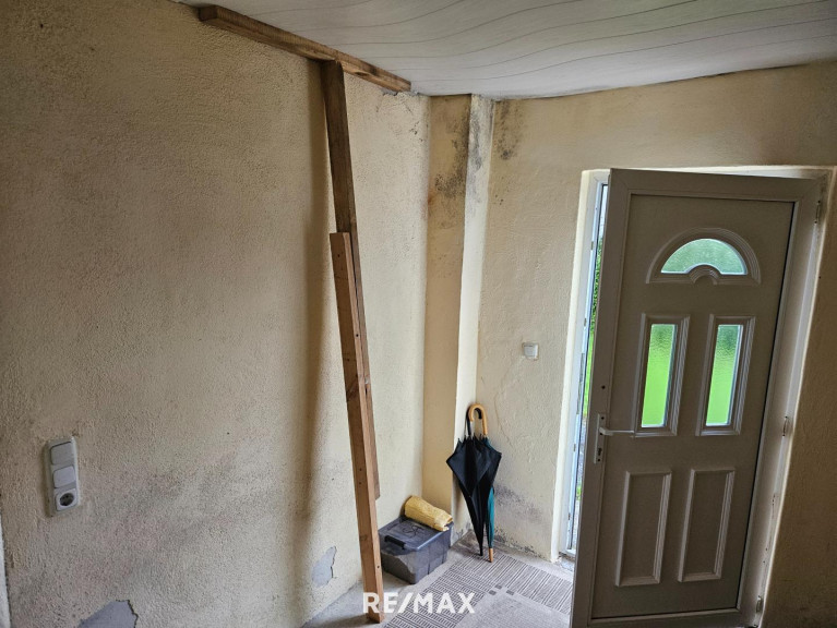 Über dem Eingangsbereich befindet sich eine Terrasse, die defekt ist und saniert werden muss, da der Eingangsbereich dadurch feucht ist.