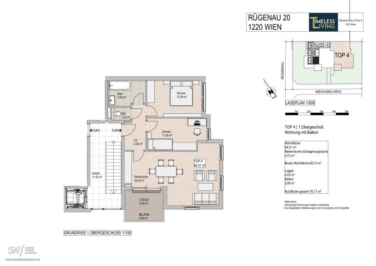 Erstbezug | 64,01 m² Wohnfläche | 7,44 m² Außenfläche ( 4,55 m² Loggia + 2,89 m² Balkon)