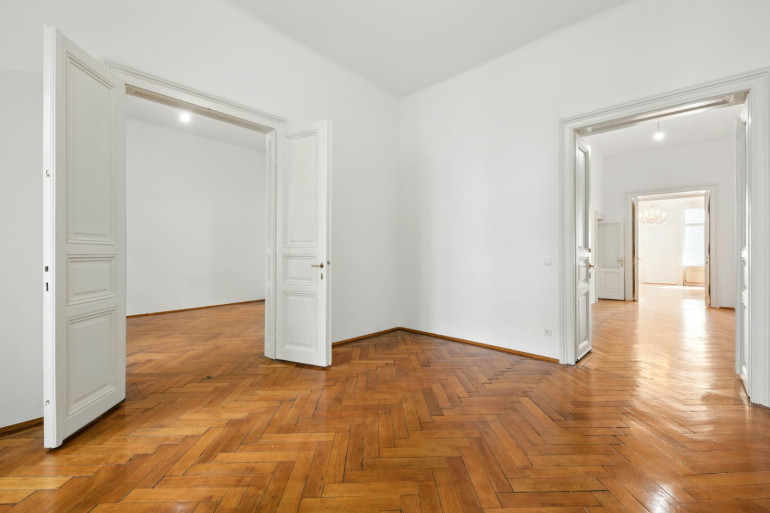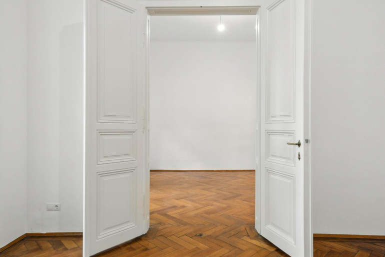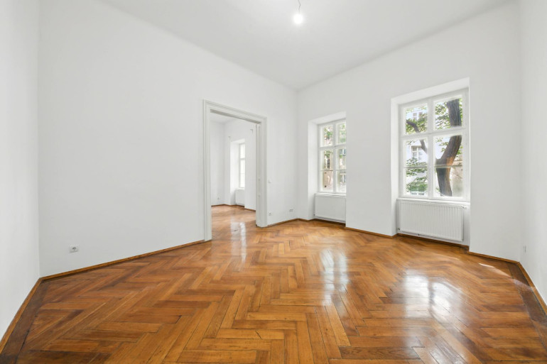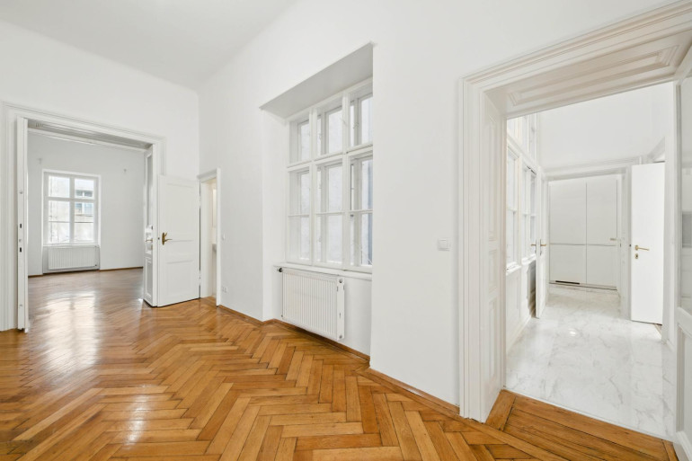 Der Grundriss ist großzügig und durchdacht: Ein großer, einladender Vorraum bildet das Zentrum der Wohnung und führt in den Wohnsalon sowie das angrenzende Speisezimmer – zwei stilvolle Räume mit großzügigen Flügeltüren, ideal für Repräsentation oder familiäres Beisammensein. Zwei ruhige, hofseitig gelegene Zimmer bieten Rückzugsmöglichkeiten mit Blick ins Grüne. Ein Verbindungskorridor mit Lichthof erschließt die moderne, komplett ausgestattete Küche. Das Badezimmer ist mit Badewanne, Waschtisch und Waschmaschine ausgestattet, das WC ist separat begehbar. Ein Kellerabteil steht ebenfalls zur Verfügung.