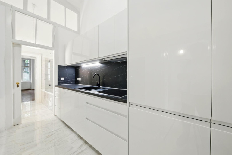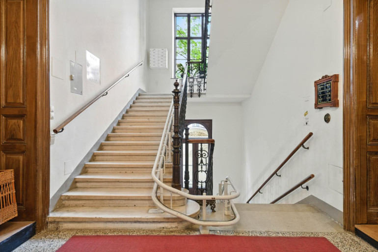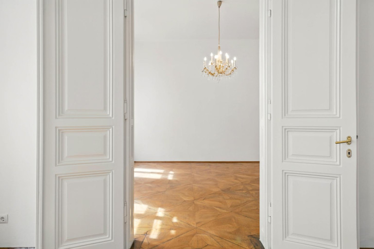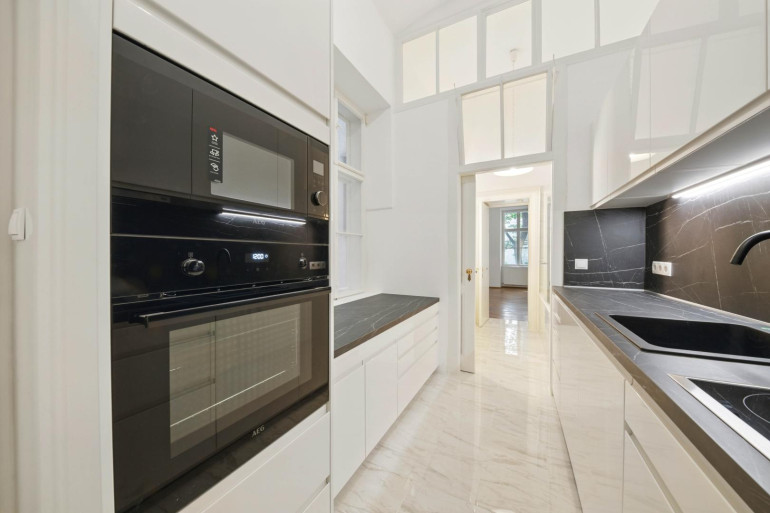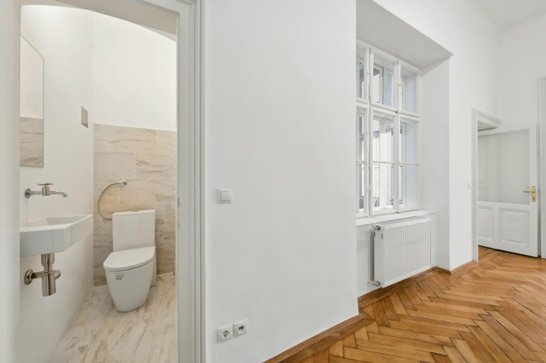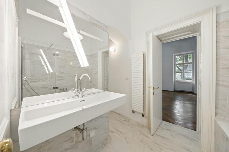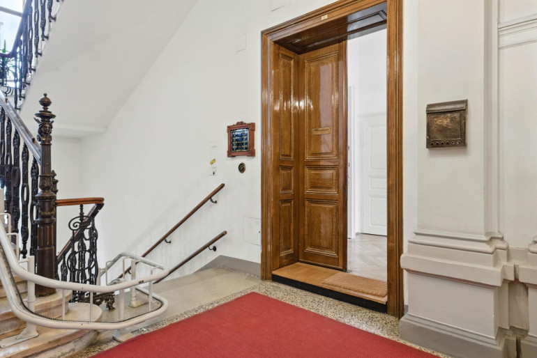 Die Ausstattung verbindet klassische Altbauelemente mit hochwertiger Erneuerung: Sternparkettböden, elegante Flügeltüren und Marmorböden im Eingangsbereich verleihen der Wohnung ihren historischen Charakter. Küche, Bad und WC wurden vollständig renoviert und auf modernen Wohnstandard gebracht.