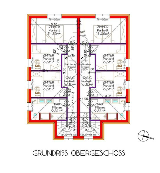 Im Obergeschoss befinden sich drei getrennt begehbare Schlafzimmer, ein großzügiger Gang mit Option auf einen Schrankraum, sowie ein gut belichtetes Badezimmer mit Fenster.