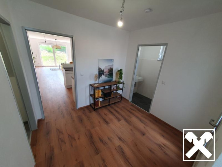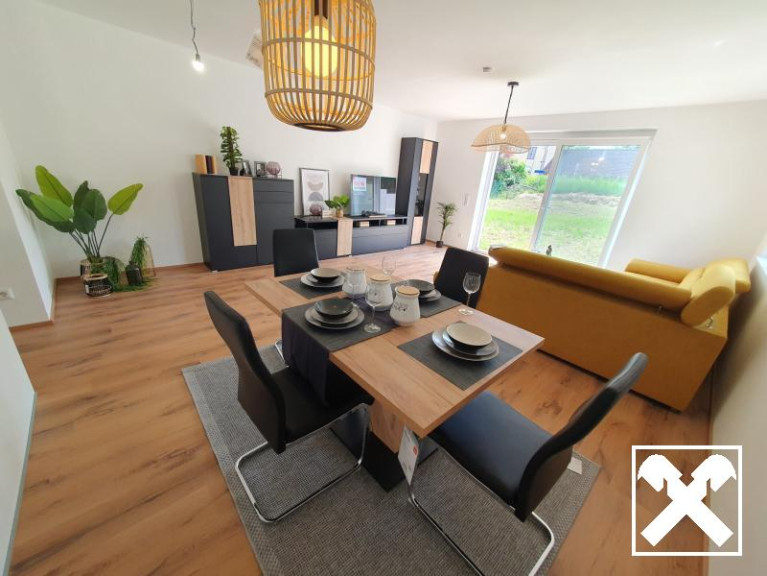Die Raumaufteilung ist klar strukturiert und familienfreundlich: Im Erdgeschoss erwartet Sie ein lichtdurchfluteter, offener Wohn-Koch-Essbereich mit direktem Zugang zur Terrasse und in den Garten. Ergänzt wird diese Ebene durch ein Vorzimmer, ein Gäste-WC, einen Technikraum sowie einen zusätzlichen Abstellraum.