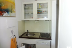 Großes Wohn- und Schlafzimmer, Kochnische, Badezimmer mit Badewanne, Waschtisch und WC, und eine große Terrasse mit Seeblick.