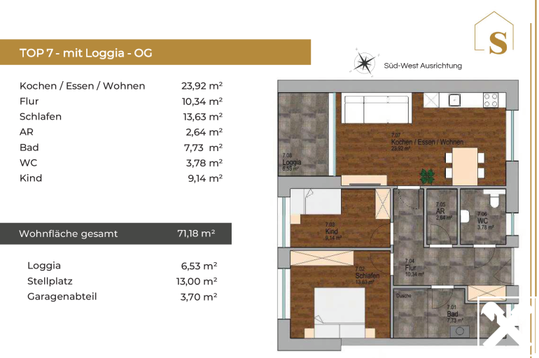 Raumaufteilung für Top 7: Flur, Abstellraum, Bad mit Dusche und WC, Schlafzimmer, Kinderzimmer, Koch- Wohn- Essbereich