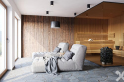 Wellnessbereich mit Sauna, Dusche und Ruhebereich mit Zugang zur Terrasse