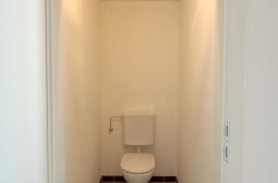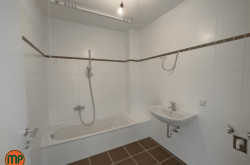 Das Bad mit Wanne hat Platz für eine Waschmaschine. Das WC ist extra, daneben gibt es einen Abstellraum.