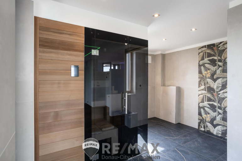 Der großzügige Keller ist ebenfalls hochwertig verarbeitet und bietet viel Stauraum. Für Entspannung sorgt die Sauna, die ebenfalls per App steuerbar ist, sowie der eigene Swimmingpool mit Schwalldusche aus Nirosta. Dieser Pool ist ein echtes Highlight: Mit Blick über alle Häuser bietet er ein unvergleichliches Luxusgefühl, das seinesgleichen sucht.
