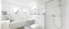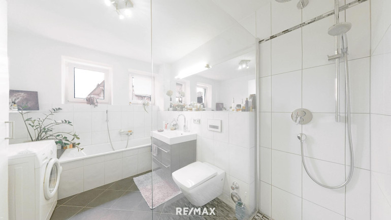 Das Badezimmer überzeugt mit einer stilvollen Gestaltung in zeitlosen Farbtönen. Ausgestattet ist es mit einem Waschtisch, einer großzügigen Dusche, WC und einem Waschmaschinenanschluss.