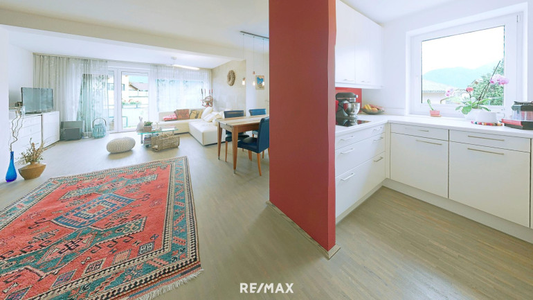 Der Wohnbereich ist der einladende Mittelpunkt des Objekts und versprüht durch viel Tageslicht und einem stilvoll integrierten Essbereich, eine besonders angenehme Atmosphäre. Die offene Raumgestaltung schafft einen harmonischen Übergang zur komplett ausgestatteten hellen Küche mit Fenster.