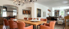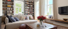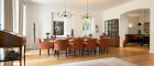 Die Zonierung wirkt selbstverständlich: Salon, Bibliothek, Speisetafel – und der Blick hinaus ins Grün.