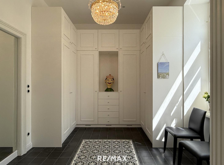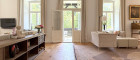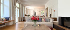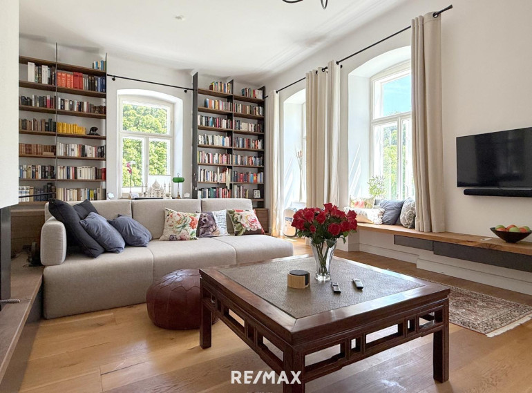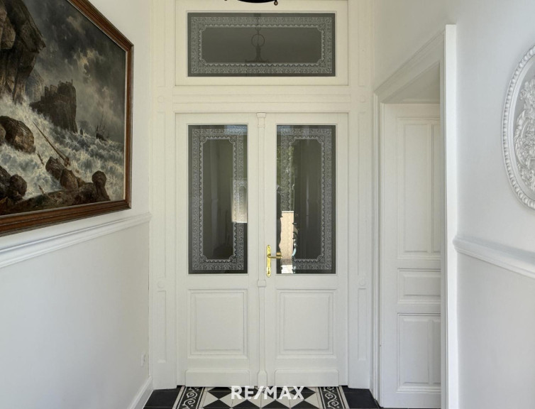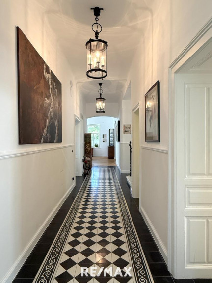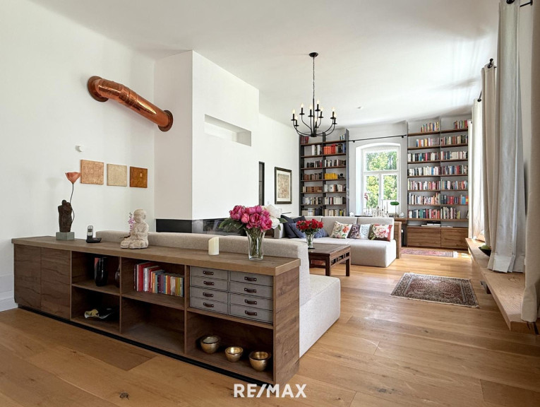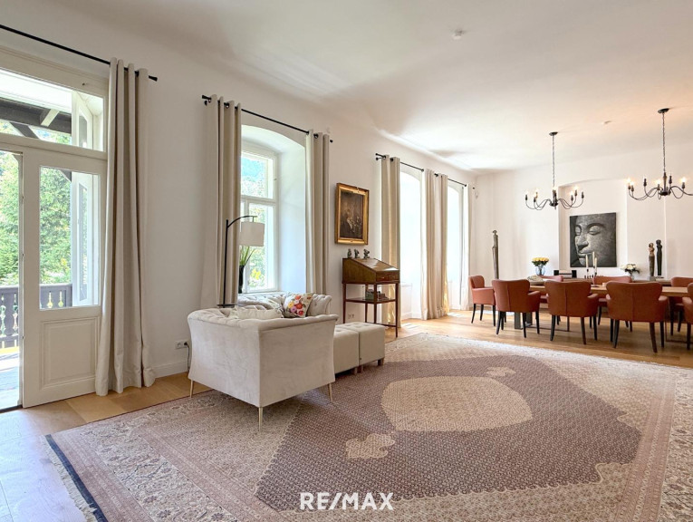 Hinter den ornamentierten Mosaikfliesen des Entrées öffnet sich ein ca. 100 m² großer Wohnsalon – lichtdurchflutet, ruhig, stilvoll.