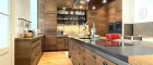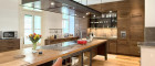Die offene Küche von Gaggenau ist ein Fest für Auge und Anspruch. Dunkle Holzfronten, versteckte hochwertigste Technik, eine Kochinsel auf schwarzem Naturstein. Darüber schwebt eine Dunstabzugshaube wie ein Designobjekt.