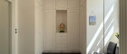 Millimetergenau eingepasste Schränke mit seidenmatten Fronten, elegante Beleuchtung, perfekt strukturierte Ordnung.