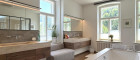 Zwei edle Natursteinwaschtische flankieren die Längsseite, dazwischen ein gepolstertes Sitzmöbel – Bad und Wohnraum zugleich.