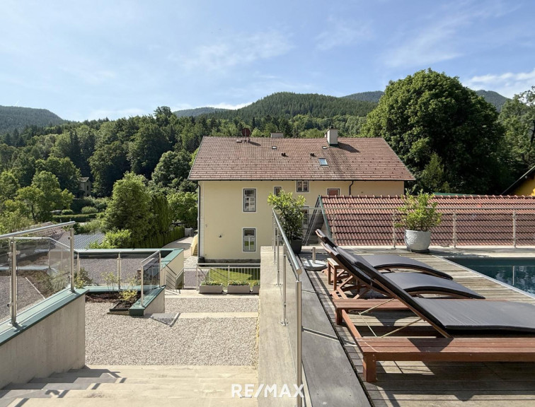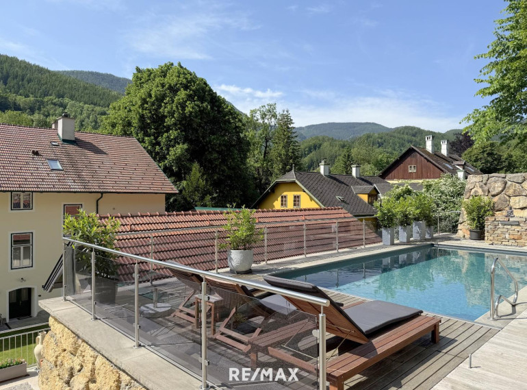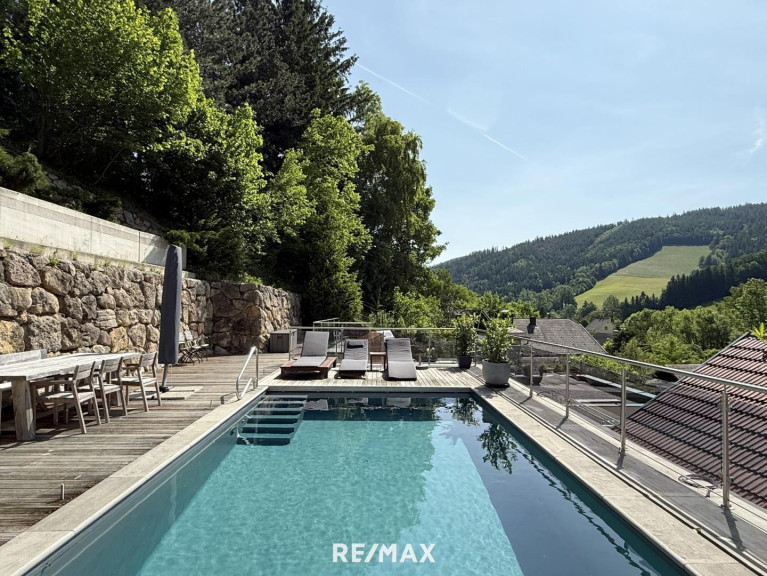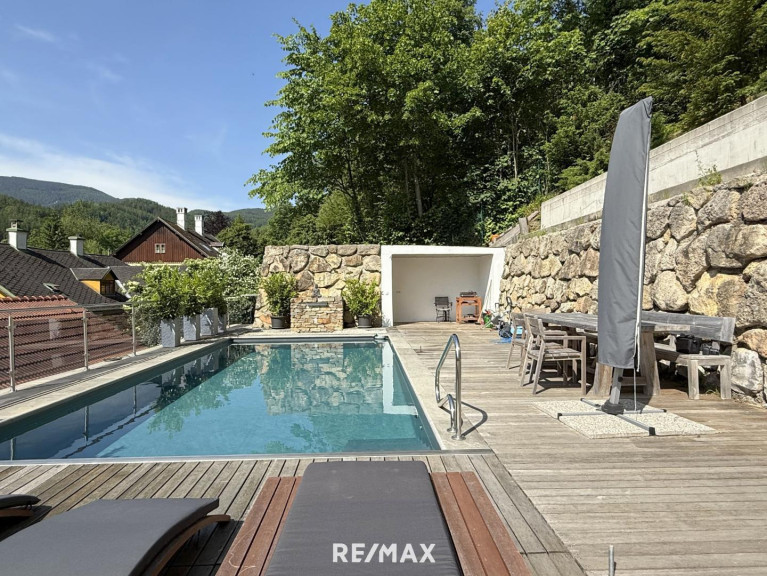 Ganz oben, am obersten Zipfel des Grundstücks, thront eine Poollandschaft der Extraklasse: ein Rückzugsort voller Eleganz und Lebensfreude.