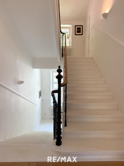 Die Treppe hinauf begleitet der kühle Glanz eines kunstvoll geschwungenen Geländers. Oben öffnet sich ein Flur, der fast an ein Grandhotel erinnert – luftig, großzügig, einladend.