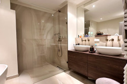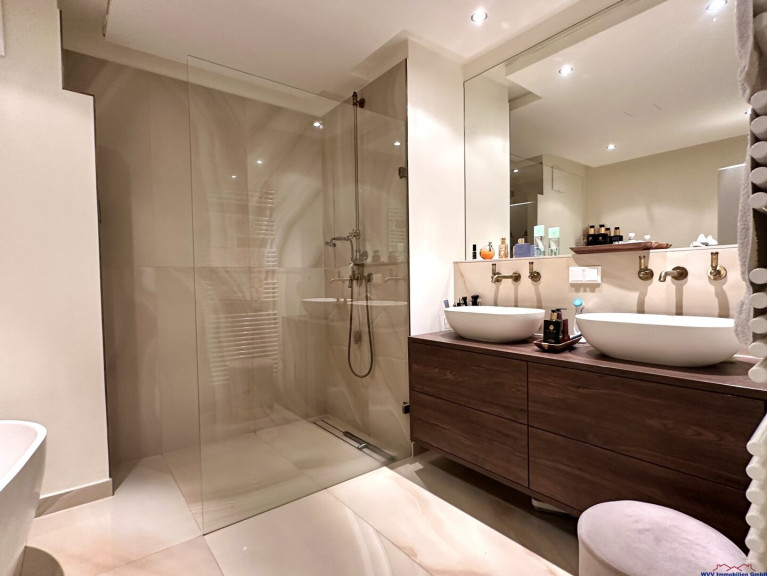 - Elegantes Badezimmer: elektr. Fußbodenheizung, Freistehende Mineralgussbadewanne, Doppelwaschbecken, Walk-in-Dusche, Handtuchtrockner, großflächige Feinsteinzeugfliesen