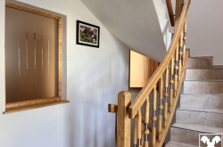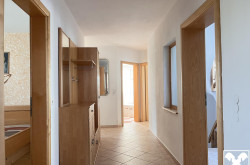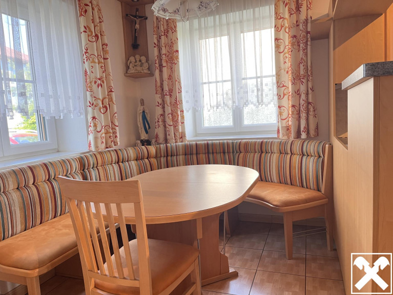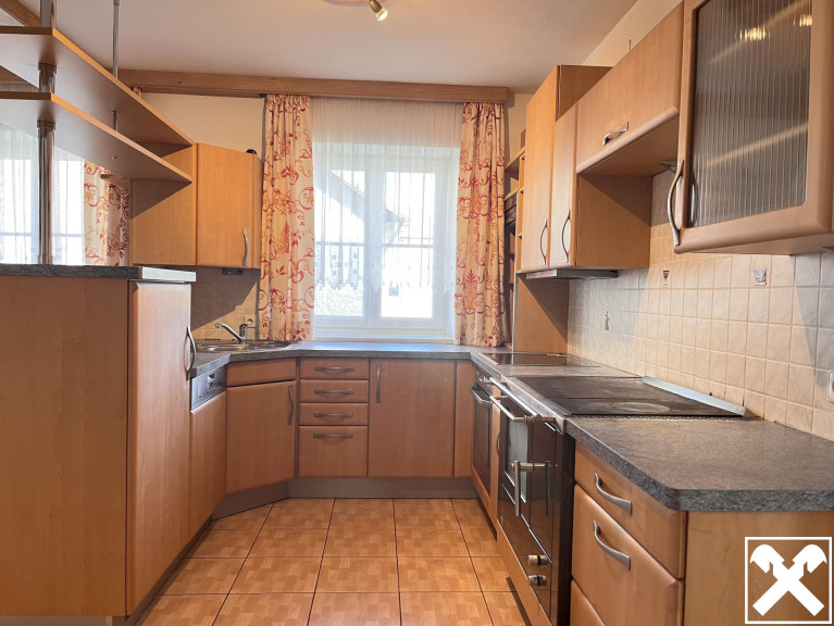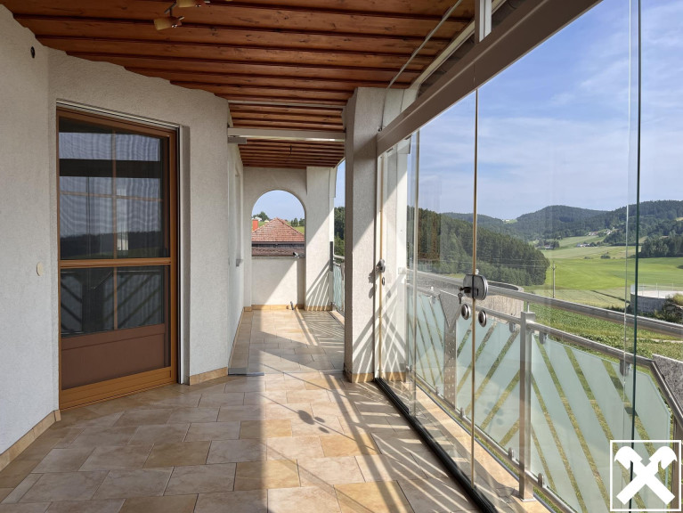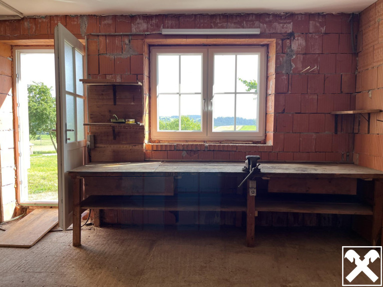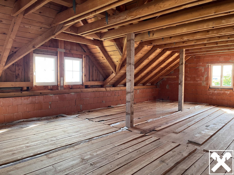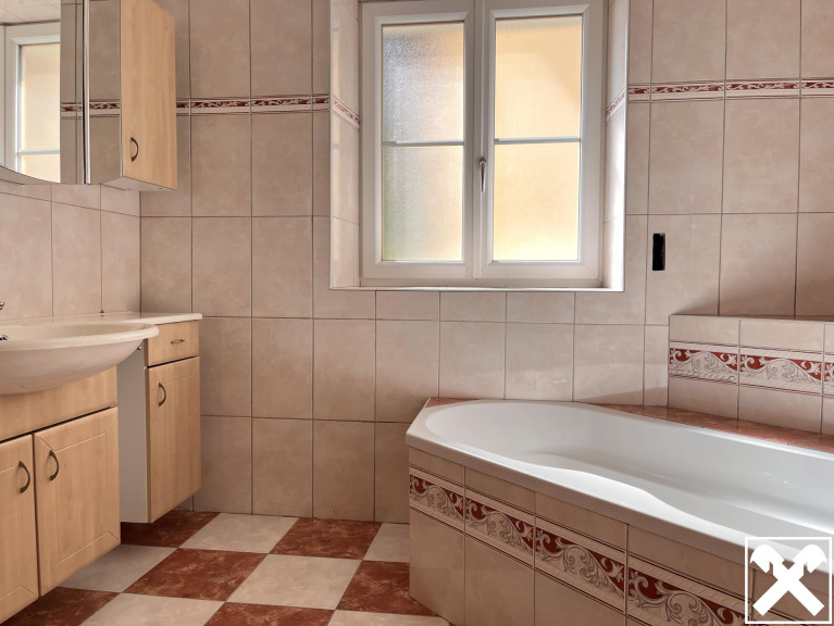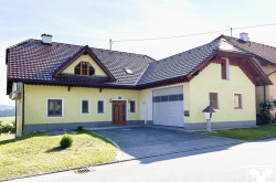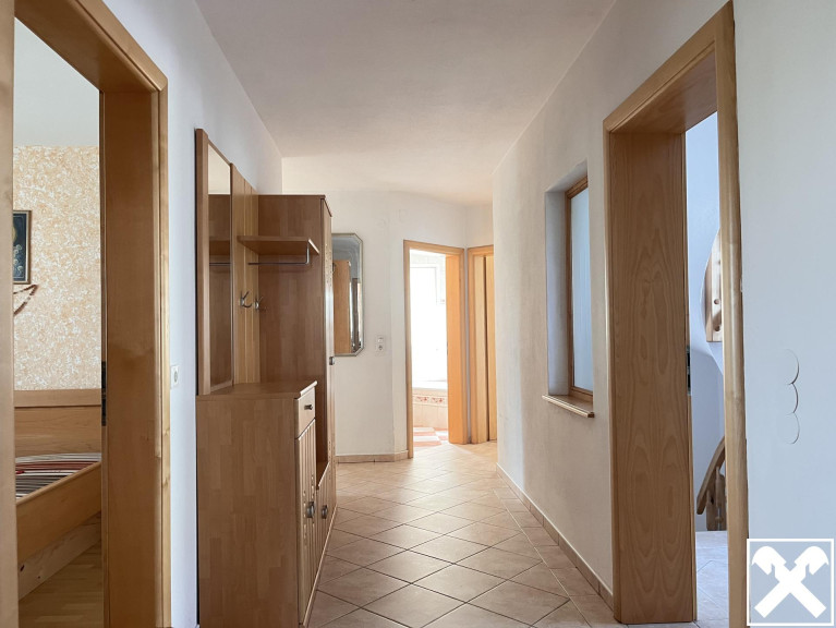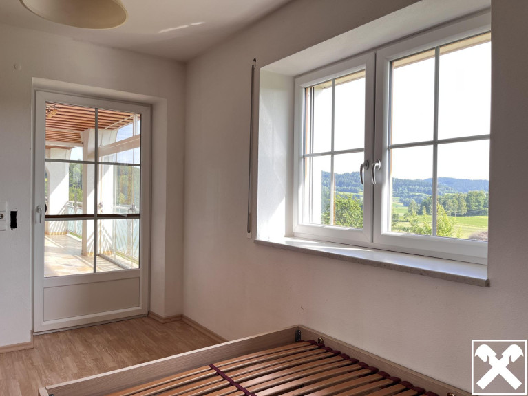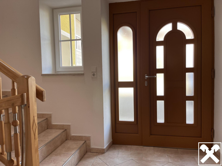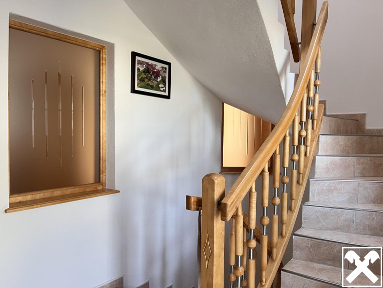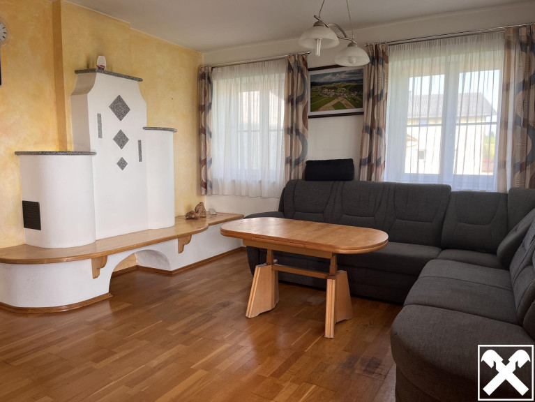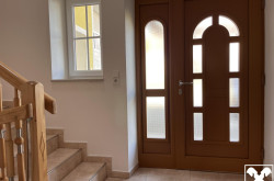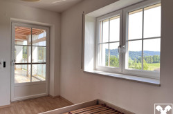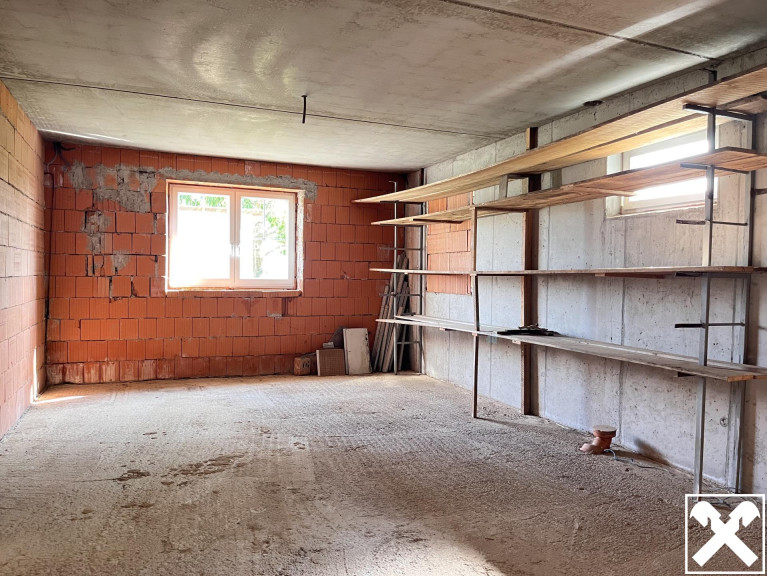 Das Haus wurde in hochwertiger Ziegel-Massivbauweise errichtet und überzeugt mit einer durchdachten Raumaufteilung. Im Erdgeschoss befindet sich eine bezugsfertige Wohneinheit – ideal für eine kleine Familie. Zwei Schlafzimmer, ein Büro, ein Waschraum, ein Badezimmer mit Badewanne sowie eine großzügige Wohn-Essküche und ein gemütliches Wohnzimmer mit Kamin schaffen eine behagliche Wohnatmosphäre. Der direkte Zugang auf die große Terrasse eröffnet traumhafte Ausblicke auf die umliegenden Wiesen und Felder. Ein zusätzliches Highlight ist die Verglasung am Balkon, sodass Sie auch an kühleren Tagen das Gefühl haben, mitten in der Natur zu sein – geschützt und doch draußen.