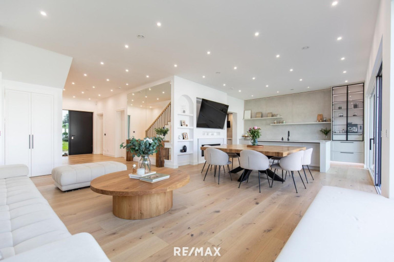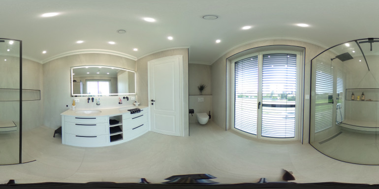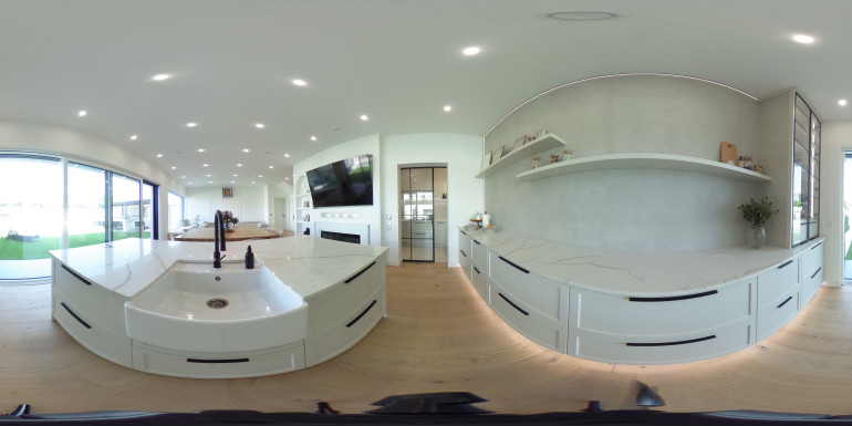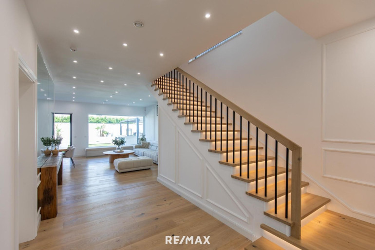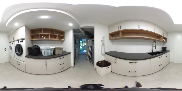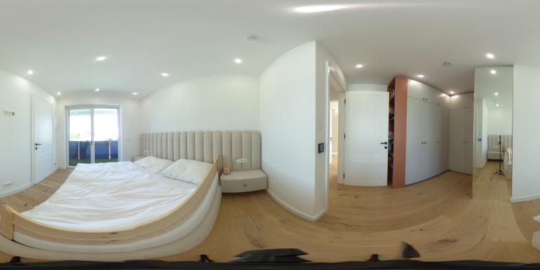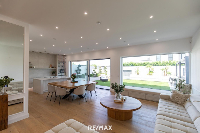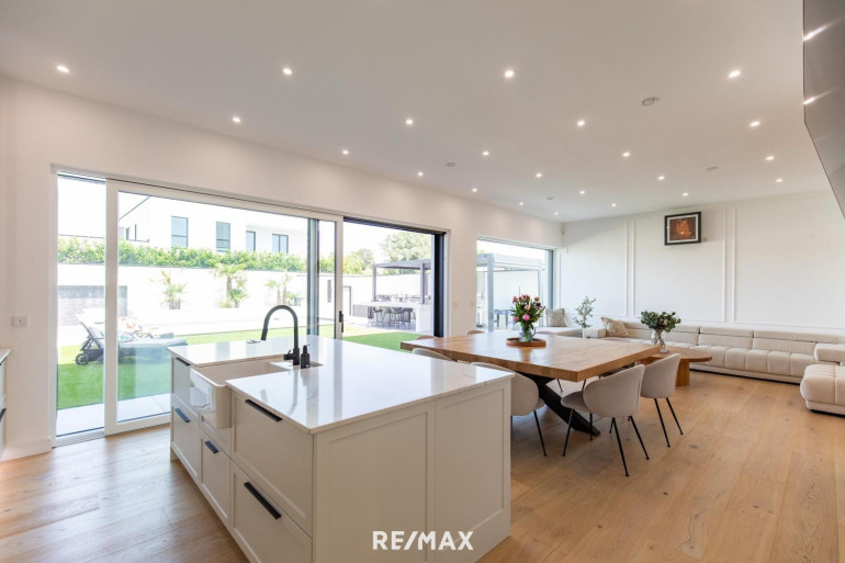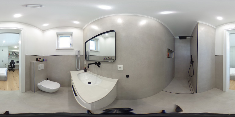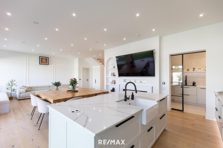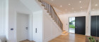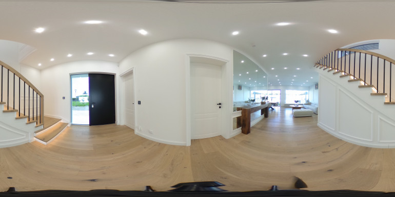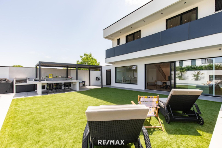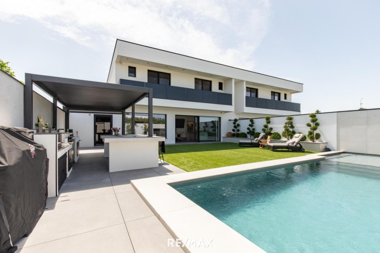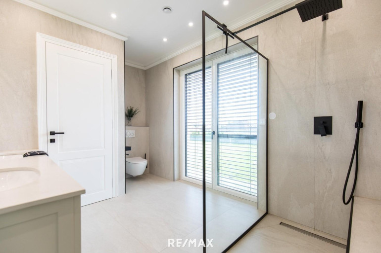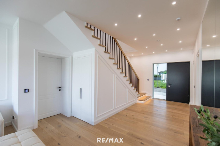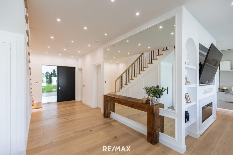 Großzügige Räume, bodentiefe Fenster und eine Deckenhöhe bis zu 3m sorgen für ein offenes Raumgefühl mit viel Licht und Transparenz. Der offen gestaltete Wohnbereich mit hochwertiger Tischlerküche samt Beiküche wird zum repräsentativen Mittelpunkt des Hauses – ideal für entspanntes Wohnen und stilvolles Hosting.