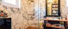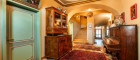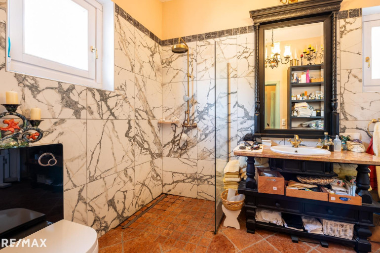 • Obergeschoss: Ein großer Salon, Küche, zwei weitere Zimmer mit alten Parkettböden Naturmarmorboden zwei Badezimmer mit Naturmarmorböden (Botticino, Rosso Verona, Carrara) sowie ein Balkon und eine 56 m² große Sonnenterrasse, elektrische Markisen.
