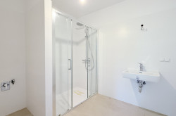 - Badezimmer mit Dusche, Handwaschbecken und Waschmaschinenanschluss