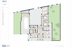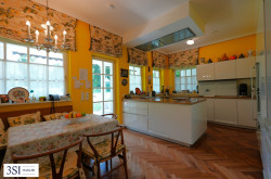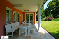 Auf der rechten Seite erwartet Sie die Küche mit Zugang zur Terrasse mit Natursteinplatten und elektrischer Markise, perfekt für entspannte Stunden im Freien. Dahinter befinden sich der Aufzug und die diskret platzierte Waschküche. Der rechte Seitenflügel bietet zudem ein Gäste-WC, eine Sauna, einen Personalbereich sowie eine elegante Schwimmhalle mit Fitnesszone. Raumhohe Schiebetüren und ein offenes Dach schaffen ein lichtdurchflutetes Wellnessambiente mit Blick ins Grüne. Ein besonderer Vorteil der Villa ist der großzügige Stauraum mit maßgefertigten Einbauschränken in Tischler-Handarbeit.