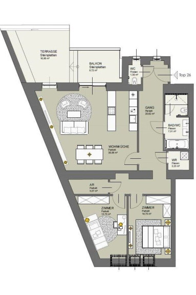 Die großzügige Freifläche (südöstlich orientiert) von insgesamt 25,28 m2, davon: 8,72 m2 Balkon und 16,56 m2 Terrasse lädt zum verweilen ein.