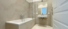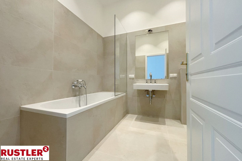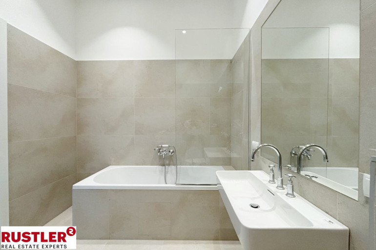 Das stilvolle Badezimmer ist mit großformatigen Fliesen ausgestattet und verfügt über eine Badewanne, ein WC, einen Waschtisch sowie einen Waschmaschinenanschluss.