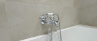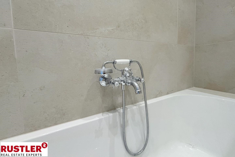Besonders hervorzuheben ist die hochwertige Armatur im viktorianischen Stil: Verchromte Oberflächen, klassische Kreuzgriffe und feine Keramikelemente verleihen dem Raum einen Hauch von Luxus und zeitloser Eleganz – perfekt für ein anspruchsvolles Wohnambiente.