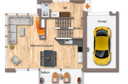- Erdgeschoss mit Eingangsbereich, Garage, zwei zusätzlichen Stellplätzen, Gäste-WC, Windfang sowie einem offenen Wohnbereich mit offenem Kamin und moderner Küche mit Zugang zum Balkon.
