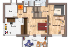 - Untergeschoss mit Badezimmer/WC, Sauna, Holzlager und drei gemütlichen Schlafzimmern – ideal für erholsame Nächte.