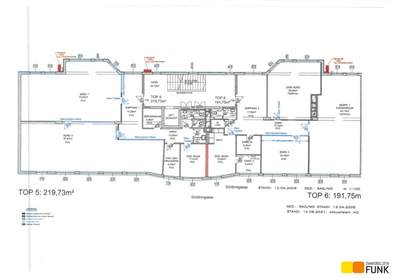 Zur unbefristeten Vermietung gelangt diese großzügige Bürofläche im dritten Liftstock eines gut erhaltenen Neubaus aus den 80er/90er-Jahren. Die Nutzfläche beträgt ca. 219,73 m² und deckt die Hälfte des ersten Obergeschosses ab. Über einen Empfangsbereich gelangt man in zwei große helle Büroräume (ca. 74 bzw. 87 m²), die sich durch eine angenehme Arbeitsatmosphäre auszeichnen. Des Weiteren gibt es noch einen Sozialraum und Toilettenräumlichkeit wie im Plan ersichtlich ist.