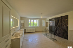 Wohnessbereich, ein Schlafzimmer, ein offenes Gästezimmer sowie ein hochwertiges Badezimmer mit Walk-In Dusche. Auch hier stehen zwei getrennte Toiletten zur Verfügung. Ein weiteres Highlight dieser Liegenschaft ist der integrierte Wellnesstempel mit Sauna & Dampfbad.