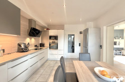 Durch die Küche hindurch gelangen Sie in das Wohnzimmer, genießen Sie hier in kalten Wintermonaten kuschelige Stunden vorm Kamin und im Sommer entspannte Sommerabende auf der knapp 24 qm großen Terrasse, die Sie über die Glasfront erreichen.