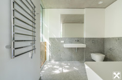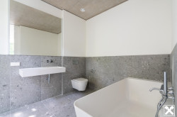 Beim Baden kann das klare Tageslicht ebenfalls genossen werden. Ausreichende Abstellbereiche und Ankleideräume sorgen für angenehm entspannte Ordnung. Luxus für Ihr Herz auf allen Ebenen.