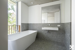 Beim Baden kann das klare Tageslicht ebenfalls genossen werden. Ausreichende Abstellbereiche und Ankleideräume sorgen für angenehm entspannte Ordnung. Luxus für Ihr Herz auf allen Ebenen.