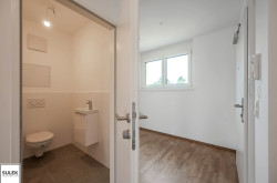 Die Wohnung Top 9 im Dachgeschoß (2. OG) von Haus 1 bietet auf 75,7 m² ein durchdachtes Raumprogramm mit Vorraum, drei Zimmern, Abstellraum, Badezimmer und separatem WC. Von allen Zimmern führt der Ausgang auf die rund 48 m² große Terrasse, die den Wohnraum um wertvolle Freifläche erweitert. Eichen-Echtholz-Parkett, großformatige Fliesen mit hochwertiger Keramik in den Nassräumen sowie eine Sicherheits-Eingangstüre runden das Gesamtpaket ab und sorgen für Wohnkomfort auf zeitgemäßem Niveau. Zusätzlich gehören ein Kellerabteil sowie optional verfügbare Garagenplätze in der Tiefgarage zum Angebot.