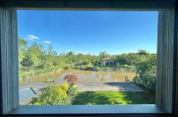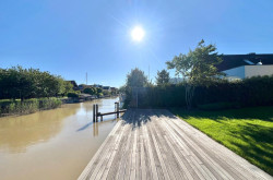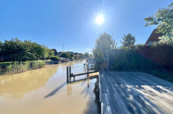 Vorraum, 53m² großes Wohn-Esszimmer mit offener Küche und Ausgang auf die 34 m² große südtseitige Terrasse sowie in den Garten mit anschließender Bootanlegestelle,