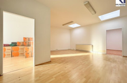 Eingang über das Stiegenhaus, Empfang/ Wartezimmer, 2 straßenseitige Räume, innenliegender Besprechungs-/ Raum durch 2 Lichtkuppeln tagesbelichtet, Küche mit Eßecke, WC mit Waschtisch, ein Duschbad.