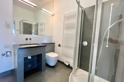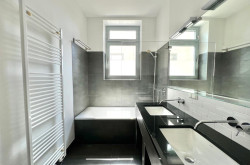 • Naßräume mit anthrazitgrauem Feinsteinzeug und Designarmaturen ausgestattet