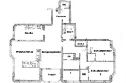 Vorraum, großzügige zentrale Eingangshalle (ca. 23m²), großes Wohnzimmer (ca. 26m²) mit Grünblick, von beiden Ausgang auf eine ca. 6m² große Loggia mit Blick auf den auf den Pötzleinsdorfer Schloßpark, große Küche (ca. 11m²), 3 Schlafzimmer (ca. 11m², 11m² & 9m²), 2 begehbare Schrankräume, ein Wannenbad mit WC (ca. 5m²), ein Duschbad sowie ein separates WC, Garderobe und Abstellraum.