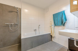 Das geräumige Badezimmer ist mit einer Badewanne, Dusche und Waschgelegenheit ausgestattet. Hier befindet sich auch ein Waschmaschinenanschluss. Das WC befindet sich separat angrenzend gelegen.