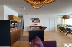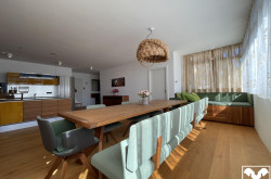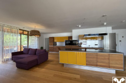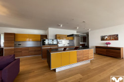 Vom Entrée hat man gleich den Blick in die helle, lichtverwöhnte Wohnung, zu rechterhand das Gäste WC. Die von der Firma Team 7 geplante und mit feinsten Materialien maßgefertigte Wohnküche, mit grifflosen Fronten, Echtsteingranit Arbeitsplatte und Miele Markengeräten bildet mit dem im Anschluss präsentierten Esstisch das kommunikative Zentrum der Wohnung.