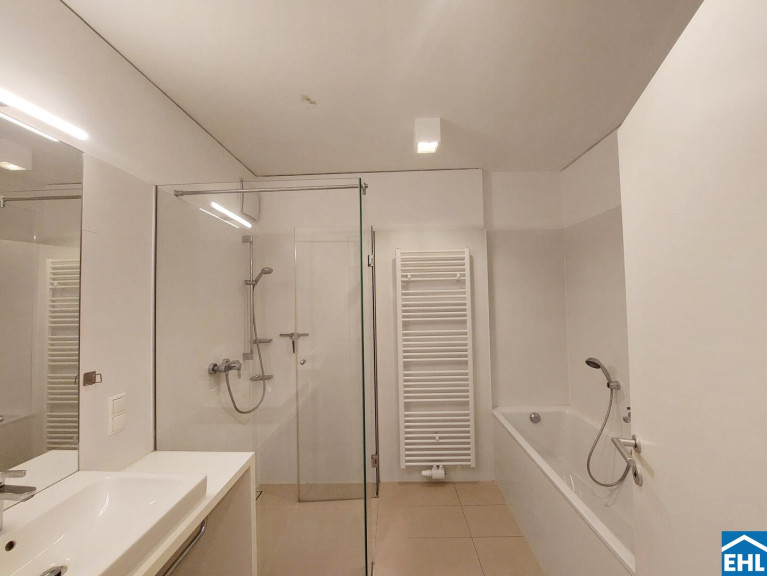 - Badezimmer mit Dusche (ebenerdig) und Badewanne