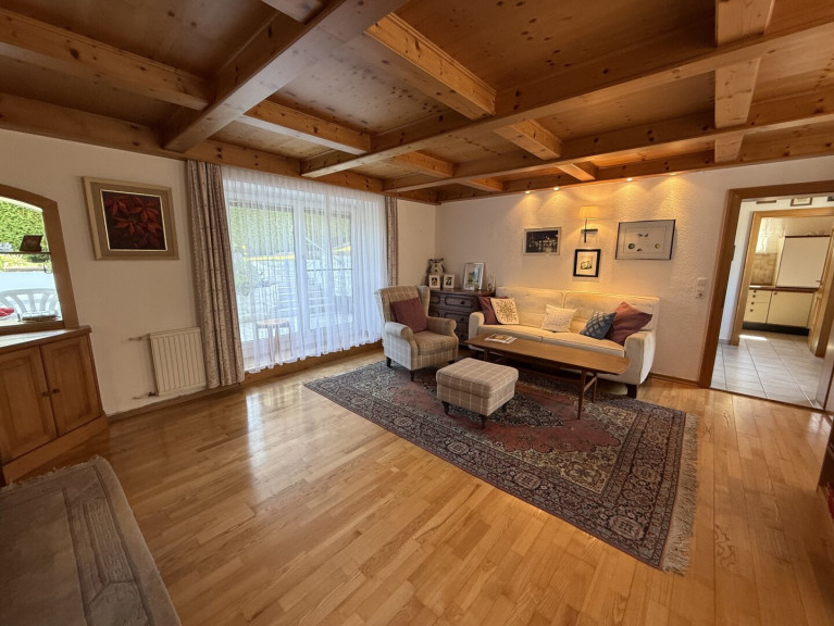 gemütlicher Wohnbereich mit Ausgang auf die vorgelagerte, überdachte Terrasse samt SW-Pool