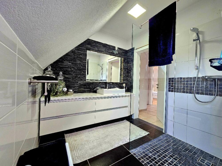 - Modernes Badezimmer mit Badewanne und Dusche.